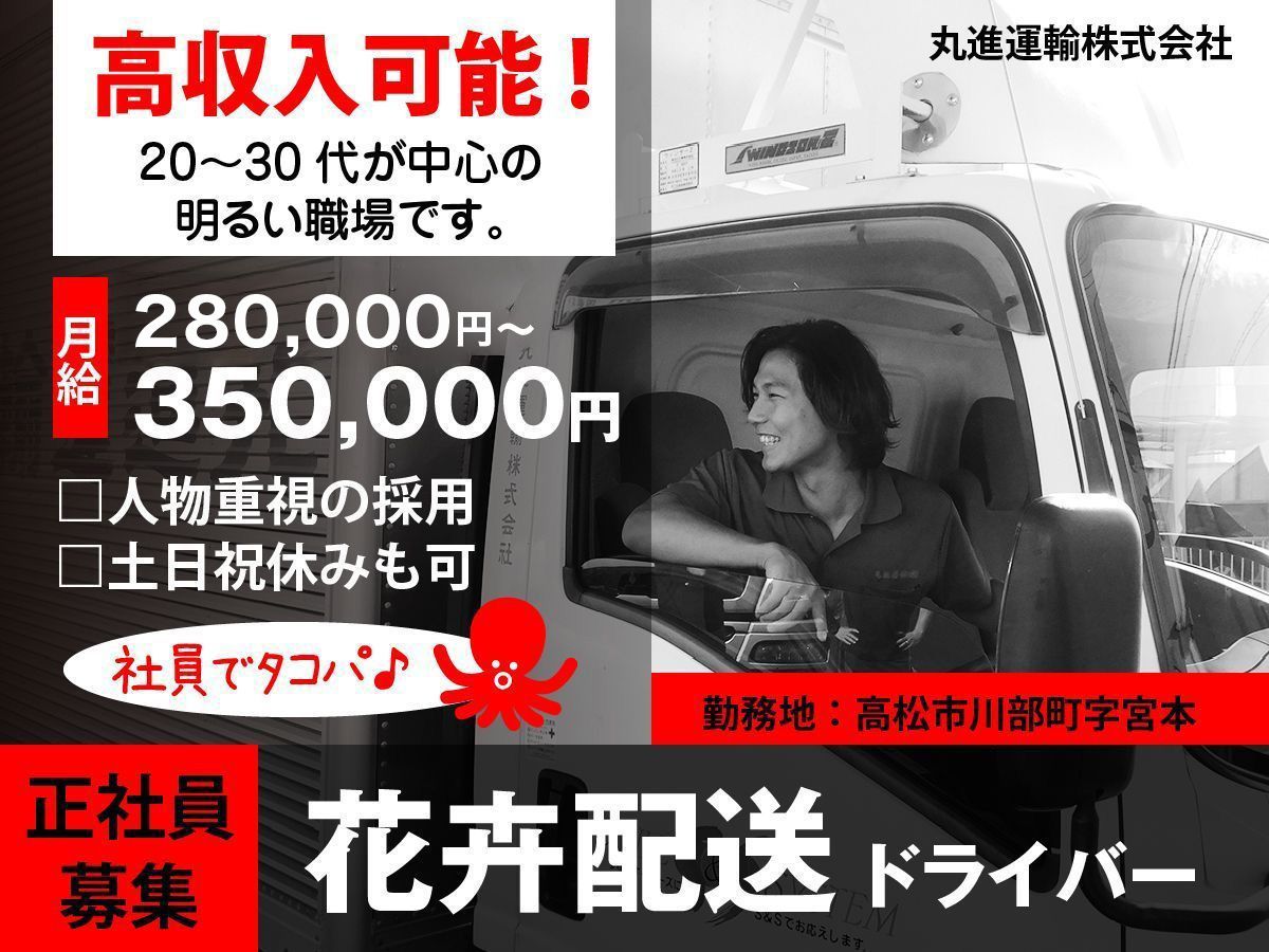 香川・徳島県内で集荷した花を大阪の市場まで輸送します。 力仕事だと思われるかもしれませんが、パワーゲート(台車)による荷物の積み下ろしなので、体力面の負担は最小限に抑えられます。 [取り扱い商材] 花(切花、鉢花) [配送ルート] 香川・徳島から大阪、翌日は大阪から香川 固定ルートですので、慣れればスムーズに仕事が進みます! 【やりがい】 自分が運んだ商品が店頭に並んでいるのを見ると、お店から更に商品を求めている方のもとに届くという事を実感でき、やりがいを感じます。 運ぶものはお花なので、季節を感じられる風流があります。 生商品のため、自分で時間調整をして早く届けることで喜んで頂けます。