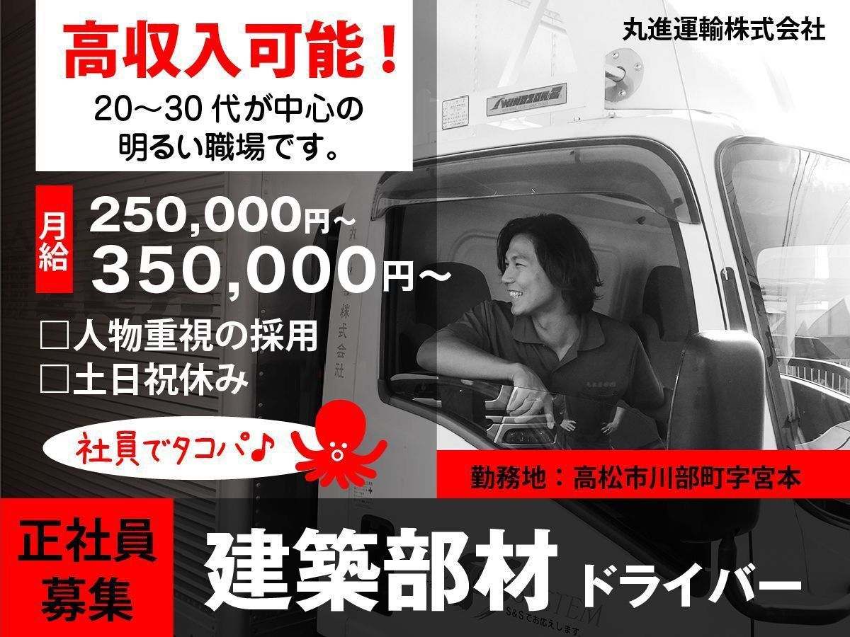 建築部材の運送を行います。 郵送エリアは四国・岡山です。 1日に2.3件程度の積み込み、下ろしを行います。 運搬物は、大手メーカーのアルミサッシ、断熱材など。 現場への搬入となります。 土日祝休みの完全週休二日制なので、プライベートの充実が可能です! 【やりがい】 自分が運んだ商品が店頭に並んでいるのを見ると、お店から更に商品を求めている方のもとに届くという事を実感でき、やりがいを感じます。 自分で時間調整をして早く届けることで喜んで頂けます。